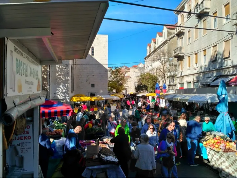 Lively atmosphere along a market street in Split, Croatia