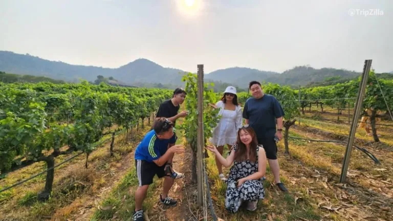 Next on our itinerary was Monsoon Valley Vineyard, nestled among the rolling hills of Hua Hin. I’ve done wine tours in Australia and Europe, so I had an idea of what to expect, but I was still surprised to see vineyards thriving in tropical Thailand. Our guide drove us around the property to show us the different wine grapes grown on site. Spanish, Italian, and French varieties are cultivated here, which is quite rare in this corner of the world!