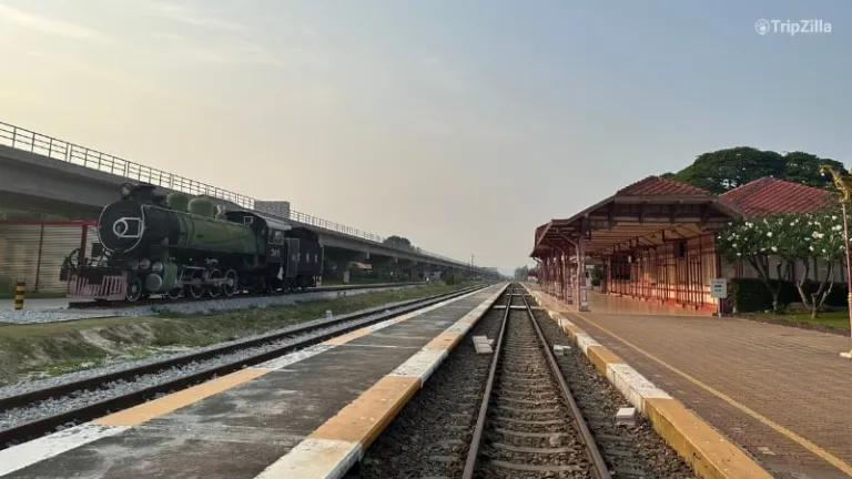 Next, we visited the historic Hua Hin railway station, which is reputed to be one of the most beautiful in Thailand. As one of the oldest stations in the country, it showcases exquisitely preserved Thai architecture, offering a glimpse into a bygone era. We arrived at sunset and walked along the disused tracks, admiring the ornate design that glowed in shades of red, yellow, and orange under the fading light.