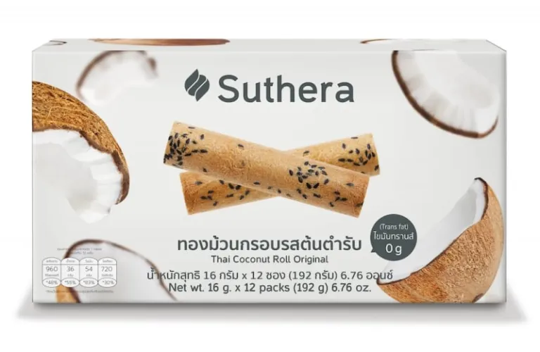 Want the perfect melt-in-your-mouth Thai dessert? Well, it doesn’t get better than Suthera’s Thai Coconut Roll! This delectable sweet treat is a local product of Kanchanaburi province of Thailand and is made with the finest ingredients. The star ingredient of the Thai coconut roll is coconut milk made from the freshest coconuts, evidenced by the fragrance and flavour of the coconut.
