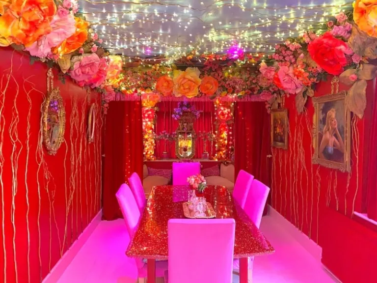 Get ready to out-pink everyone else at The Pink House that’s our pick for glam parties, kitschy fun, and eye-catching snaps. Located in the Essex countryside, the fantastical boutique house is brimming with lavish pink decor, sparkly streamers, giant flowers, and chandeliers. You won’t know where to hang out first. Fireman bar or the neon-lit lounges? Outside the pink house, a separate saloon bar, an open-air caravan, and a Barbiecore courtyard are also available for guest use.