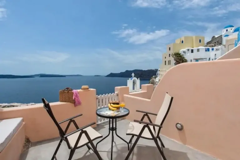Just because you’re in Santorini doesn’t mean you’ll have to go for one of the classic whitewashed cave houses that everyone stays in. Instead, commit to your Barbie lifestyle with a pink Airbnb. This pristine apartment in Oia blends light pink hues with the traditional Greek house architecture to create a one-of-a-kind stay in the South Aegean! Best of all, you get your own slice of paradise with a terrace overlooking the dazzling Caldera.