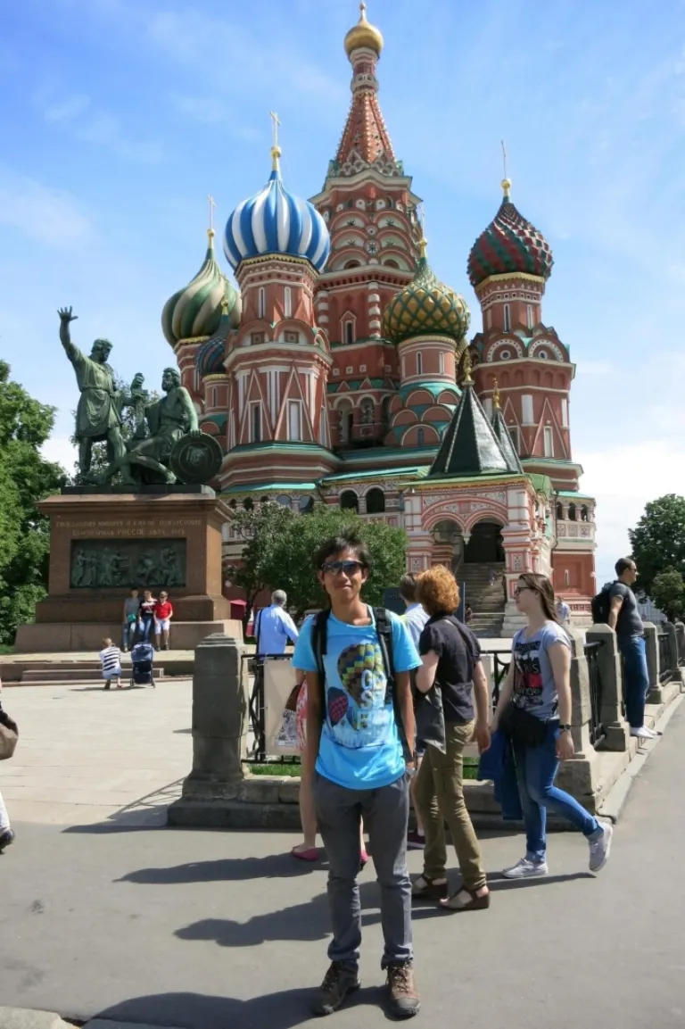 Standing in front of the famous Saint Basil cathedral in Moscow