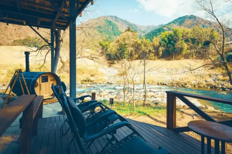 Nestled on the banks of the Yoshida River in Gujo is this tranquil one-bedroom villa that puts you right in the heart of the leaf-peeping scene in Japan. As autumn approaches, the forests surrounding the vacation rental burst into a symphony of fiery colours — a striking contrast against the clear blue waters of the river below.