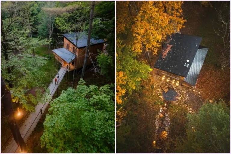 When it comes to the best Airbnb for fall foliage in the United States, you’ve got a wealth of choices across the country. But it’s hard to beat this five-star treehouse in New York’s Adirondack Mountains. Follow a hanging cable bridge to the immaculately designed treehouse, which is furnished with high-quality amenities: a chef’s kitchen, a wood fireplace, and Netflix-ready TVs, among other things.