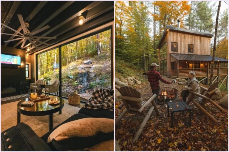 A place to unplug, relax, and soak in the views of the flame-coloured forests, the Adirondack cabin promises a fall vacation like no other. Toast marshmallows by the firepit or snuggle up indoors while enjoying the scenic forest through large picture windows.