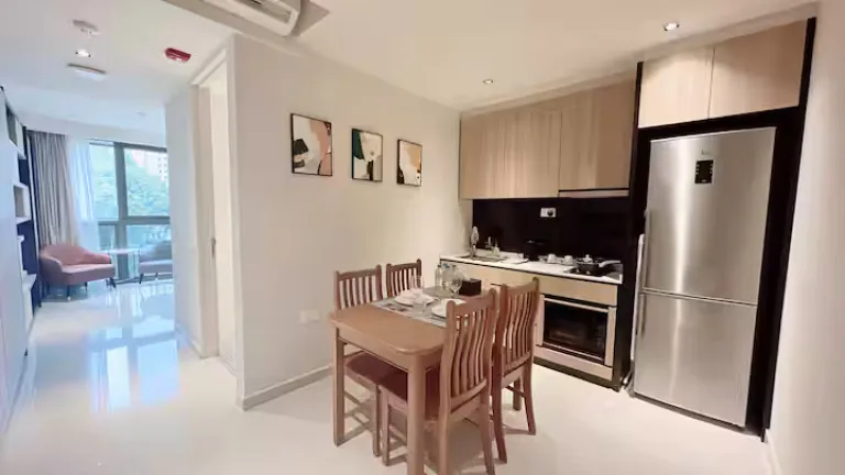 A stylish one-bedroom Signature Suite in Bugis, this 37 sqm serviced apartment comfortably accommodates up to four guests. Featuring a separate living area, modern kitchen, washer-dryer, and bright interiors, it’s perfect for a relaxing city stay. Located steps from attractions such as Bugis MRT and The White House, it is a lovely luxury Airbnb in Singapore near Marina Bay that blends colonial heritage charm with contemporary comfort.