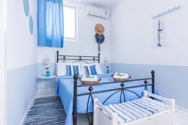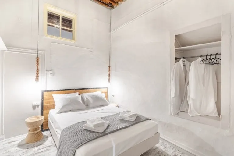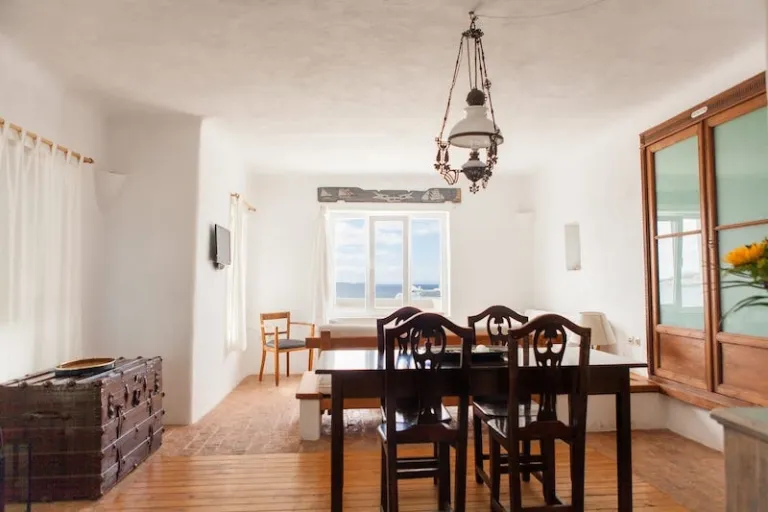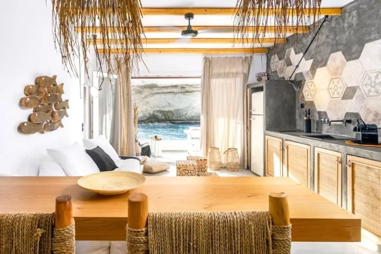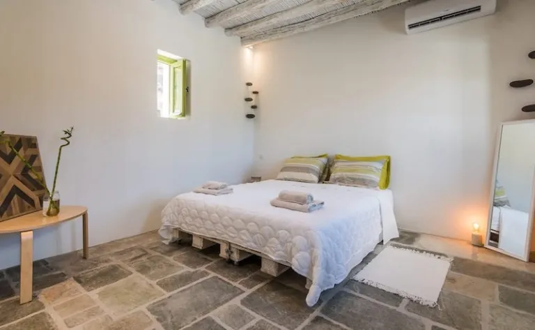 Rarely will you find an Airbnb in Greece that feels like having an entire island to yourself, yet this postcard-worthy beach house on Milos lets you live right on the water’s edge. Here, you can drift off to the sounds of the waves, swim in turquoise waters, or bring a glass of wine to the rocky shoreline facing the sea. With private beach access and free parking space, this Cycladic house allows sun-seekers to dip their toes back into the paradise we call Greece.