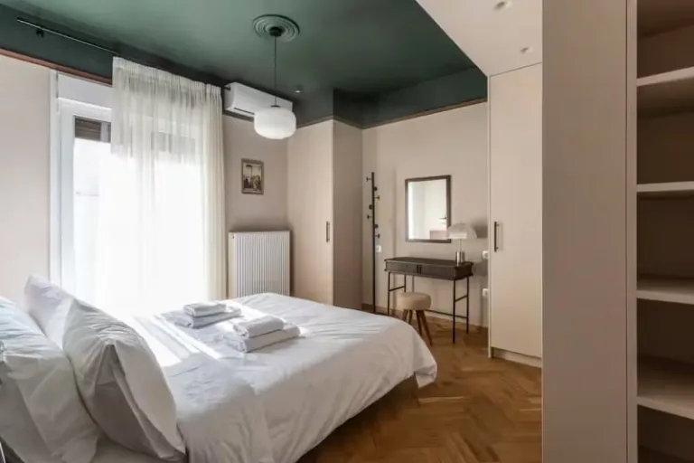 This is a large upscale 4-bedroom Athens apartment perfect for big groups or families. Each bedroom has an ensuite bathroom, and highlights include sweeping views of the Temple of Zeus, Parthenon, and Lycabettus Hill, a balcony, and modern comforts like a hot tub and workspace. Furthermore, the staycation stands out for its central location, excellence for sightseeing and relaxation.