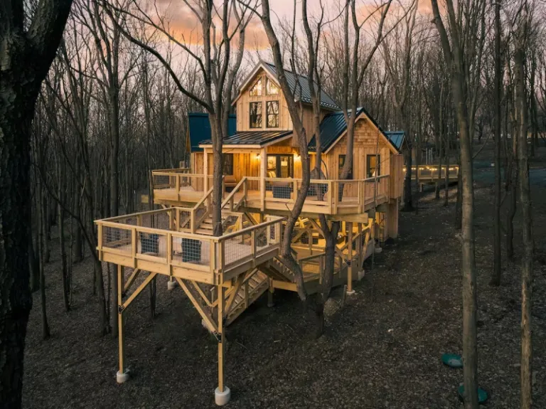 This is a custom-made treehouse that’s nestled in a tranquil and gorgeous spot surrounded by stunning scenery. In fact, it’s just minutes away from Deep Creek Lake and the famous Wisp Resort. The indoors feature an impressive wooden-style design as well, complete with fully equipped kitchen and a sitting area with a 65-inch TV. Moreover, you’ll have facilities such as fire-pit and hot tub outdoors.