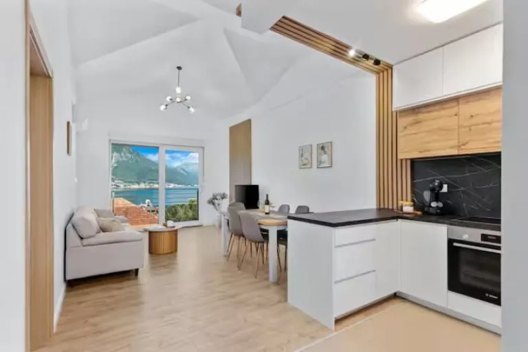 Designed by professional interior stylists, this new apartment in Kotor offers elegant comfort in a peaceful neighborhood. Its spacious terrace overlooks both mountains and sea, while the interior features modern furnishings, a fully equipped kitchen, and thoughtful amenities such as Netflix and Apple TV. Free private parking and proximity to bakeries, cafes, and the waterfront make it ideal for couples or families seeking a stylish home base close to the Old Town.