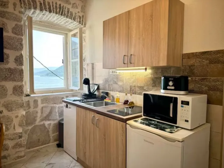 Tucked high above Perast’s charming sea road, this apartment offers some of the most striking views in town. Both balconies reveal postcard-worthy panoramas of bell towers, islands, and shimmering waters. Inside, two stylish bedrooms and a full kitchen make it ideal for families or small groups. Though reaching it requires a few steps through Perast’s historic lanes, the views and atmosphere are worth every climb.