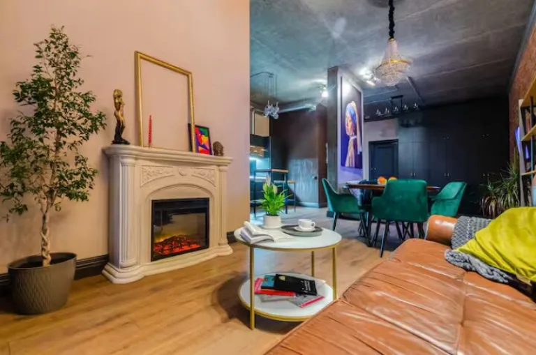 Located on the twenty fifth floor, this open-plan loft delivers dramatic city views from every room. Featuring multiple lounge areas, a fireplace, full kitchen, and two sleeping zones, this Airbnb in Kyiv is both stylish and functional. Guests will enjoy its artistic décor, expansive windows, and close proximity to parks and shopping. For travelers who want panoramic views and a touch of luxury in a quiet district, this penthouse is a stunning option.