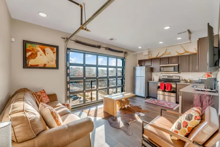 This is a fourth-floor rustic style loft in Downtown Lawrence. The designing is really unique indoors, and is full of sunlight as well. You’ll also have tons of restaurants nearby. Another advantage is guests will have access to the special building patio with a grill, fireplace, patio furniture, and hot tub.