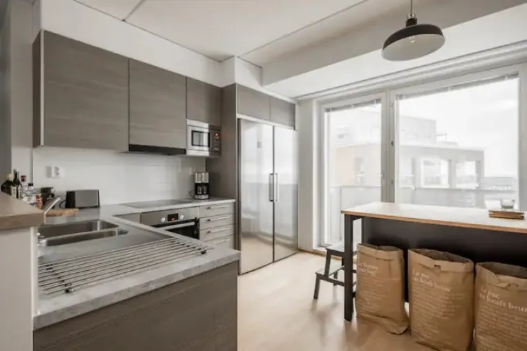 For a touch of luxury, this spacious two bedroom apartment is perfect for families or groups of friends. It offers stunning sea views, a fully equipped kitchen, a sauna, and a balcony. The best part? You’ll have a free parking space in the same building! Located in the trendy Jätkäsaari neighborhood, you’ll be close to plenty of restaurants, shops, and playgrounds.