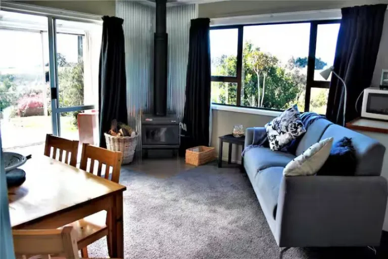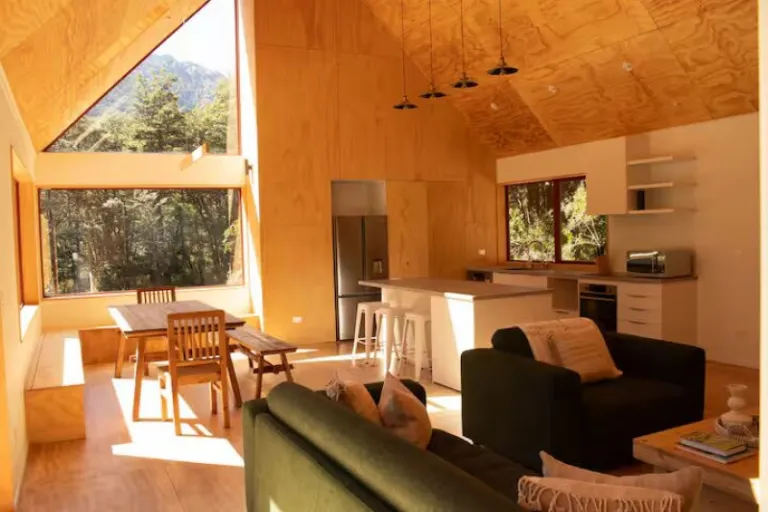 It’s ideal for families or small groups with a spacious layout that includes a bunk room, modern kitchen, wood-burning stove, and heated bathroom floors. Trails like the Devil’s Punchbowl Waterfall Walk are just minutes away, where spring and early summer bring carpets of native blooms along with kea sightings.