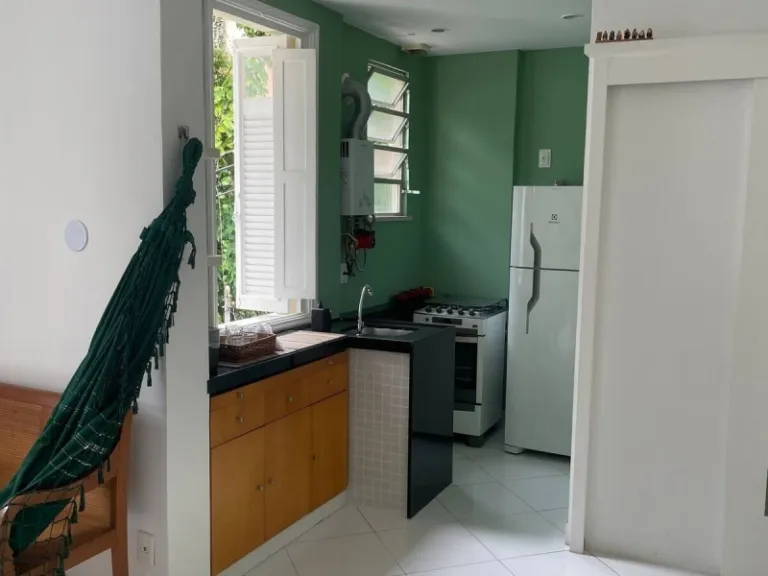 Charming and bright, this small flat is a delightful base for two in Rio’s best neighborhood. At about thirty meter square, it offers everything needed for a comfortable stay, including a fully equipped kitchen, cozy living space, and air circulation through large windows. The highlight, however, is the unobstructed view of Christ the Redeemer framed by greenery and the sounds of local birds.
