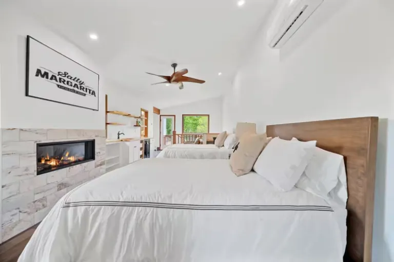 Salty Margarita sits just off Mountain Road and combines luxury with vintage ski-lodge vibes. Every bedroom has its own fireplace, and amenities include a cedar sauna, private hot tub, and game room with arcade games and ping pong. The open-concept living space has large windows that frame the foliage, while cozy touches like plush linens and a well-stocked kitchen elevate your stay.