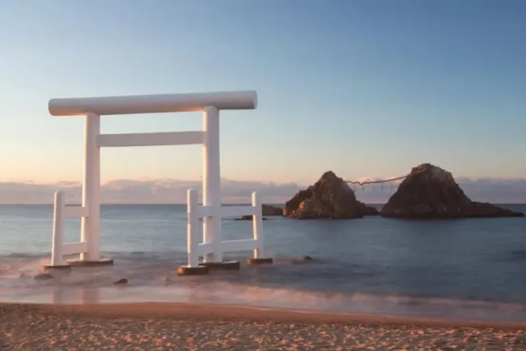 Considered to be more of a hidden gem of Itoshima, Sakurai Futamigaura is a peaceful, scenic beach where you can spot rocks peppered around the coastline. This is one of the best beaches in Japan with scenic views of a white torii gate that leads out to sea, as well as two rocks connected by a rope. The Meoto Iwa (Wedded Rocks) represent the deities Izanagi and Izanami from the Japanese creation myth and symbolises a happy marriage. This Fukuoka beach also gives you the most romantic view at sunset, which you can enjoy by finding a spot close to the shore.
