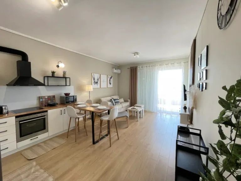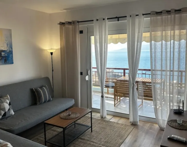 Enjoy breathtaking sea and mountain views from your balcony at this cosy apartment. Just steps away from the beach and restaurants, this newly designed space features modern amenities like air conditioning, a large TV, and a fully equipped kitchen. Relax in the king-size bed or the comfortable sofa bed, perfect for families.