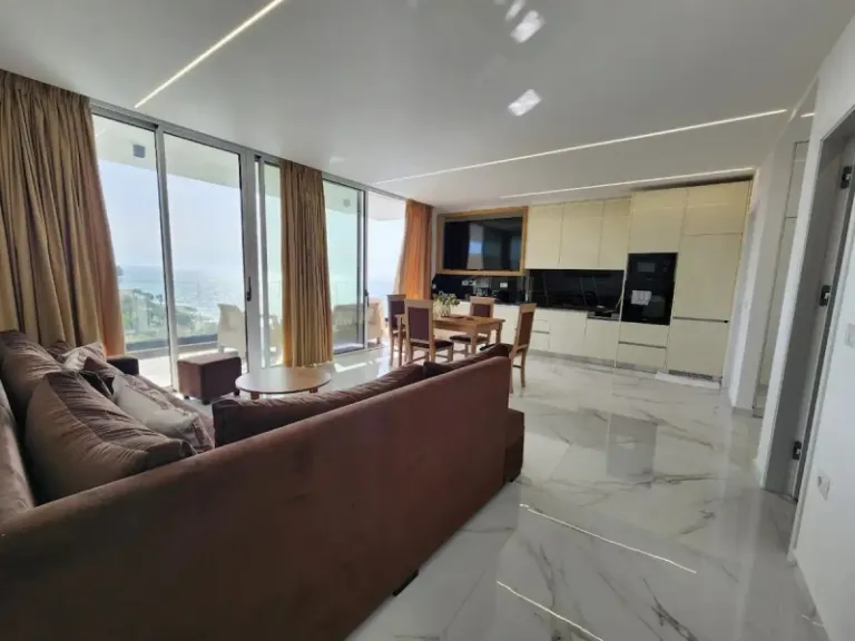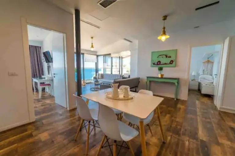 Love the sea? This beachfront luxury apartment is another excellent option for families. Its central location, beautiful design, and comfortable amenities make it a perfect home away from home. Enjoy stunning sea views from your spacious balcony, relax in the comfortable living room, and cook up delicious meals in the fully equipped kitchen.