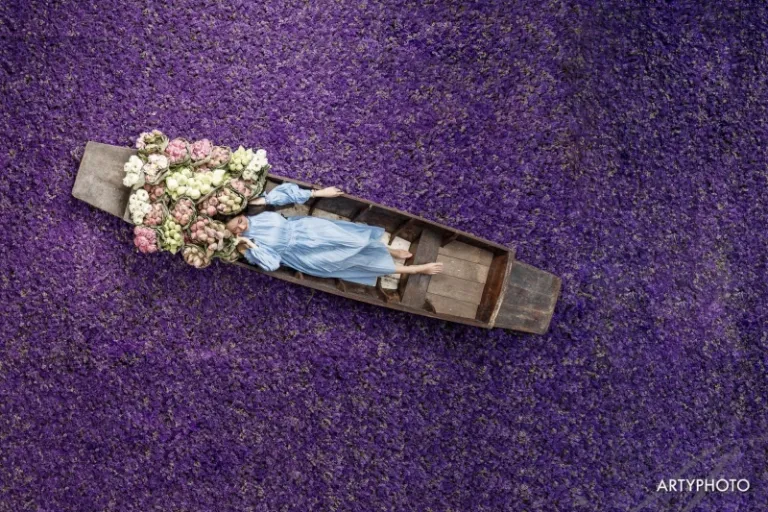 One of its highlights is indisputably this boat atop a dreamy blanket of purple Statice blooms. You will naturally feel as if you were rowing on a floral lake!