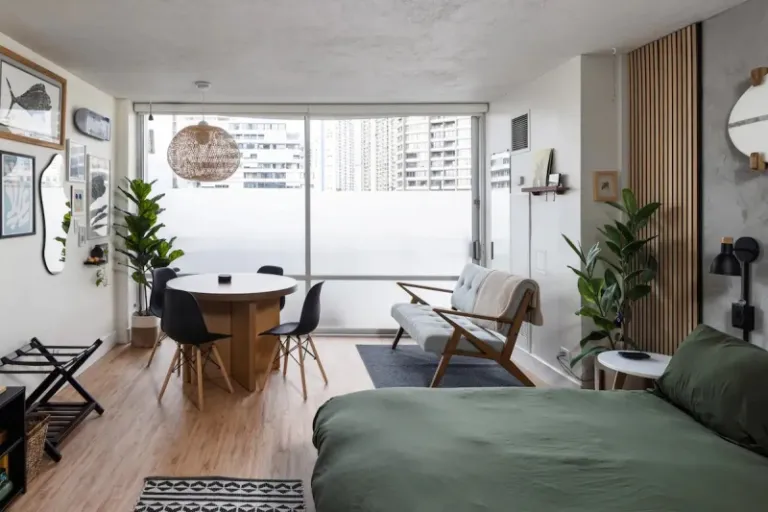 This studio apartment hidden in the heart of the city is cosy, cute, and Instagrammable. With its secure and convenient location, it’s a great choice for solo travellers or girlfriends on a BFF bonding trip! No doubt this newly renovated listing provides good value for money; it offers a comfortable queen bed, a pristine bathroom, a fully equipped kitchenette, and a little dining area. Designed to reflect the “ideal day in Honolulu,” this Airbnb features top-of-the-line appliances and unique décor touches like homemade pottery.