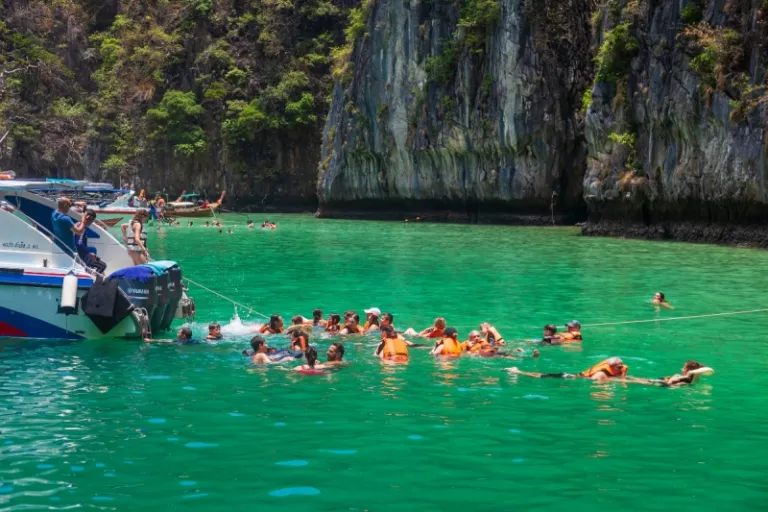 Afterwards, stop by Phi Phi Leh to visit Viking Cave and enjoy cliff jumping at Pi Leh Lagoon. For those seeking relaxation, unwind on the soft sands of Bamboo Island. You could also enjoy the vibrant atmosphere of Tonsai Bay Village: a maze of small streets on Phi Phi island where bars and restaurants come alive in the evening.