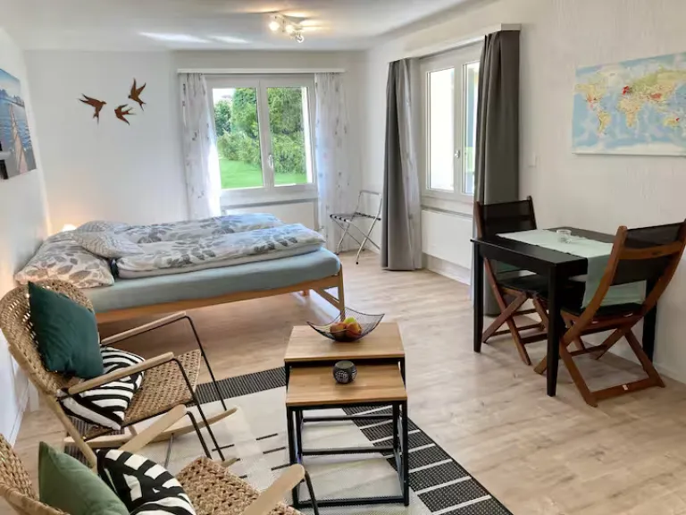 This newly renovated studio Airbnb in Interlaken offers a peaceful stay in a quiet residential area, just a short walk from Interlaken Ost station, shops, and restaurants. Perfect for year-round adventures, it features a private patio, fully equipped kitchen, and free parking. Additionally, it features a nearby bus stop as well, making it a convenient and comfortable base.
