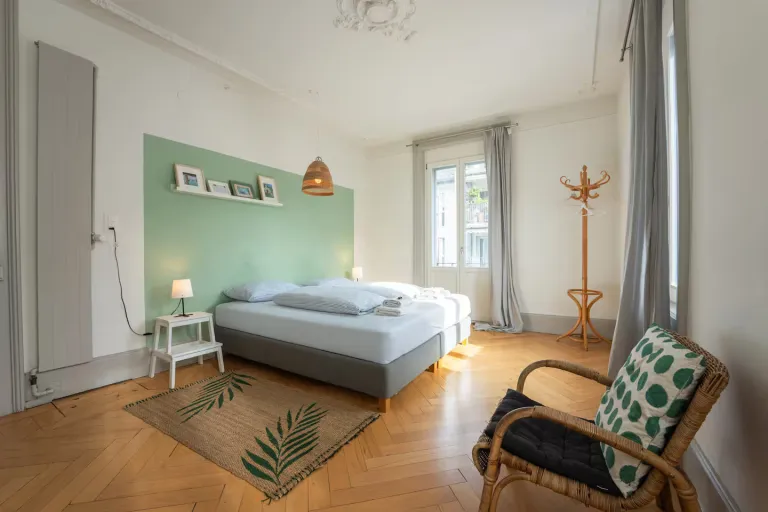 The Nele apartment in Villa Salve is a lovely pet friendly Airbnb in Interlaken Switzerland that blends historic charm with modern comfort, featuring antique touches and a warm, inviting atmosphere. With two bedrooms, a living and dining area, it’s ideal for a relaxed stay. Located just minutes from Interlaken West station and Höhematte, it offers both convenience and a peaceful neighborhood setting.