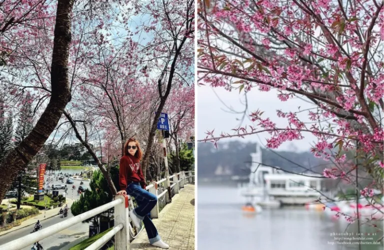 Many locals would say that the area around Xuan Huong Lake is the best place for cherry blossoms in Da Lat. It’s right in the heart of the city, so getting here via public transport should be quite convenient. Every spring, the lakeside undergoes a stunning transformation as the minh anh dao (a special type of cherry blossom tree) start to bloom and turn the city pink.