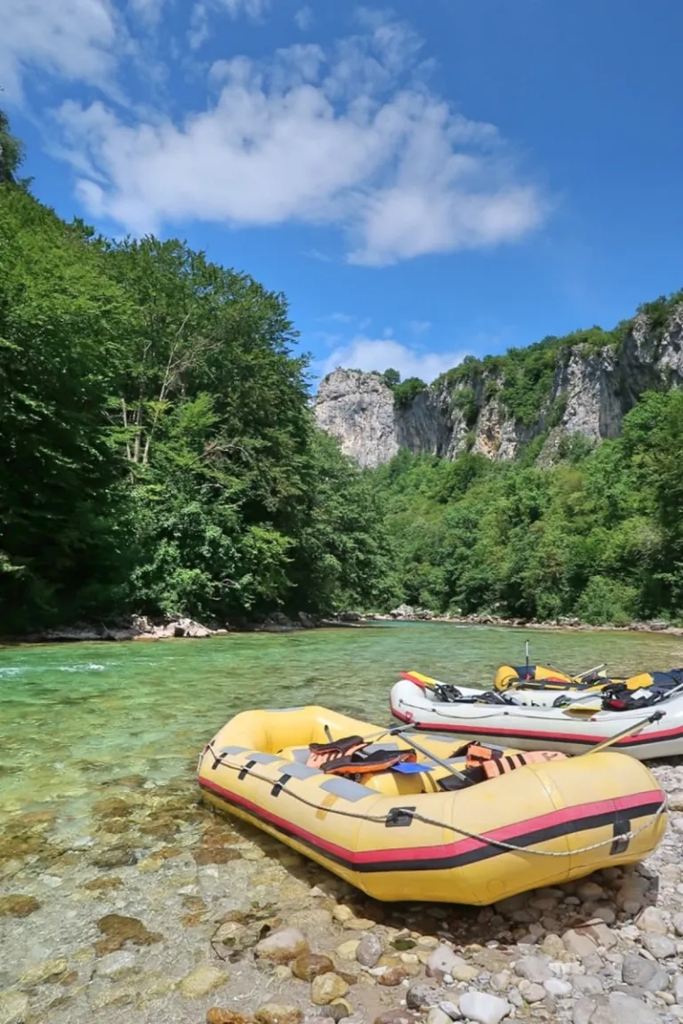 Rafts bobbing on the crystal clear waters of the Neretva River