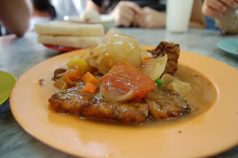 For a traditional Hainanese breakfast, look to , which has been serving its speciality fare since 1928. The number one dish on the menu is the classic Hainanese pork chops (RM 12.50), which come with side vegetables and gravy. If you are there on the weekends, also serves the upgraded roast pork option (RM 19.50).