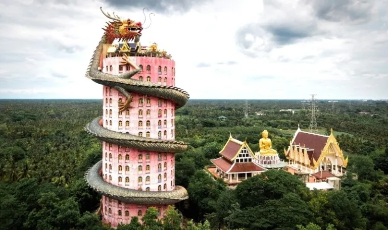 Some temples are pictures of calm and serenity. That said, this Thai dragon temple in Nakhon Pathom is straight-up one of the most badass-looking temples in Southeast Asia. Clearly, Daenerys Targaryen from Game of Thrones would’ve loved the Samphran Dragon Temple, which features a sculpture of a giant Chinese dragon wrapped around a pink 17-storey tower. Inside, a spiral staircase lets you climb all the way to the top. Sadly, though, the path has deteriorated over the years.