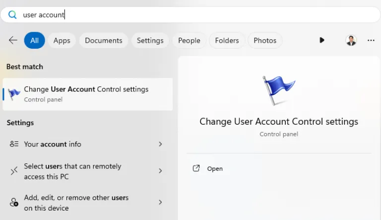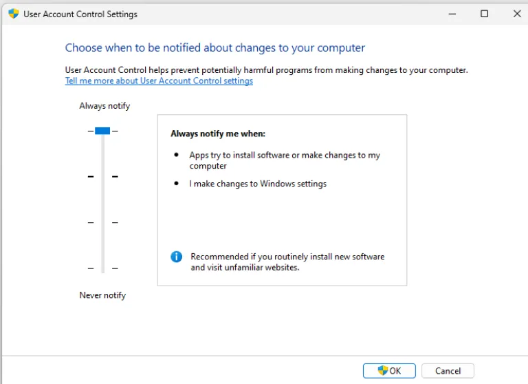 - Open the windows User Account Control Settings (Press the Windows Key and search for “User Account”)