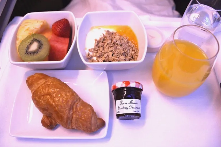 Once we were all settled in, and happily cocooned under the warm blanket in our comfy seats, I had a short nap before waking up to the delicious aroma of cheese and ham wafting through the aisles. Ah, it was dinnertime!
