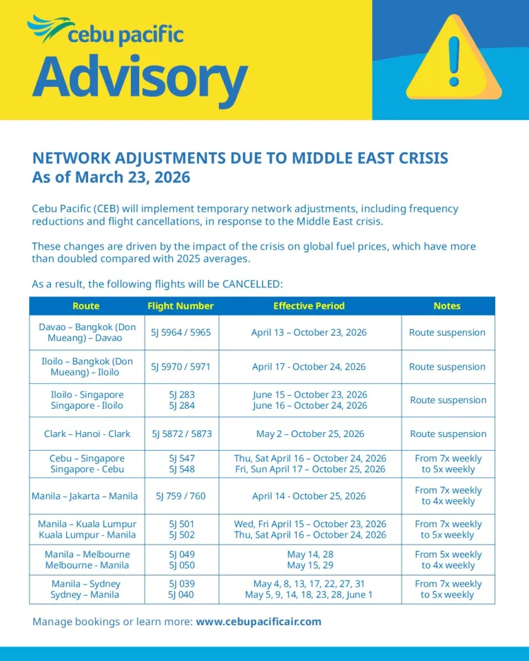 Cebu Pacific (CEB) has announced a major "temporary network adjustment" affecting several key routes across Southeast Asia and Oceania. The budget carrier cited the ongoing Middle East crisis as the primary cause, noting that global jet fuel prices have more than doubled compared to 2025 averages.
