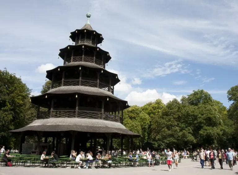 One of the most popular beer gardens in Munich can be found at the Chinesischer Turm (Chinese Tower) at the English Garden. On weekends, a brass band plays at the first level of the tower to provide a musical accompaniment to your meal. The garden often attracts a youthful crowd as it is close to the University of Munich.