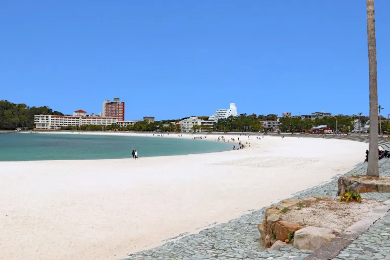 Driving further along the coast, the scenery becomes increasingly dramatic. The coastline opens up to reveal rocky outcrops and sweeping ocean views that make you instinctively reach for your camera. Shirahama Beach feels almost unexpected in Japan, with its soft white sand and clear waters. During warmer months, families can spend relaxed time by the shore while children build sandcastles or splash in the shallows.