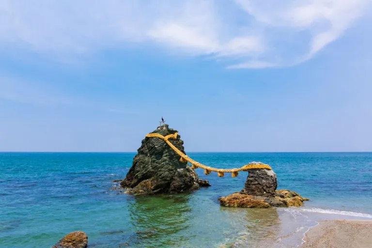 Nearby, Meoto Iwa, often called the Wedded Rocks, rise from the sea, connected by a sacred rope. It is a quick stop, but one that leaves a visual impression, especially at sunrise or sunset when the light casts a warm glow across the water.