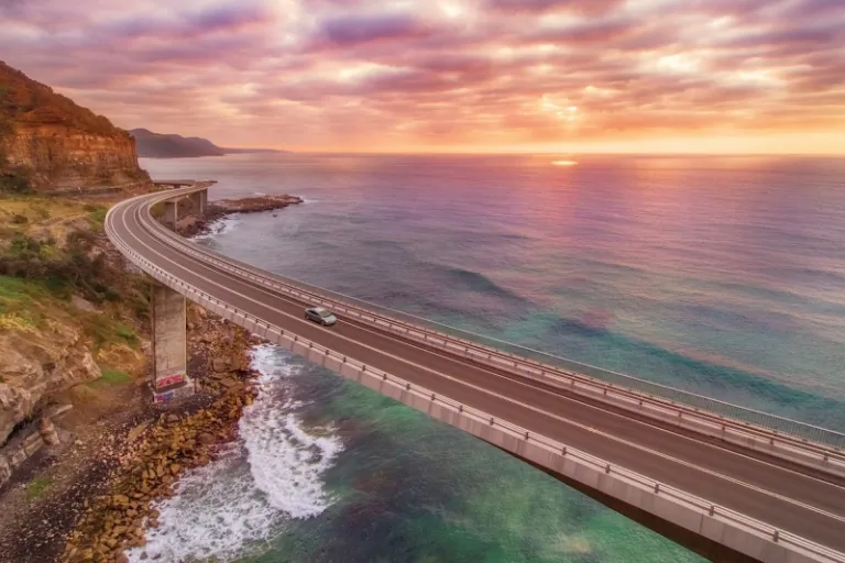 Before rejoining the highway again, you’ll meander through coastal towns like Thirroul and Coledale. Just minutes away, find yourself at the spectacular vantage point of Sea Cliff Bridge. We suggest pulling over at Stanwell Tops Lookout for a stunning vista of Grand Pacific Drive, the hills, and the South Pacific Ocean.