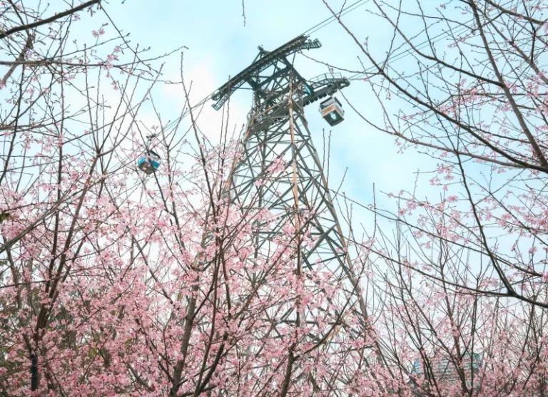 Open to the public for free, the cherry blossom garden features nearly a hundred cherry blossom trees planted along the pathways, creating a picturesque scenery that captivates visitors. As you stroll along, you can also catch glimpses of cable cars gliding overhead and bask in the serene sea view nearby. How cool!
