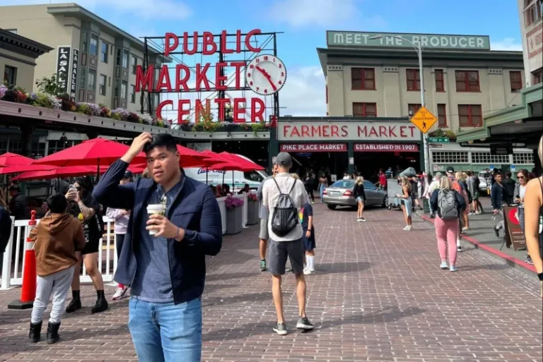 Prio posing with his compulsory cup of brew at Pike Place Market in Seattle, USA.