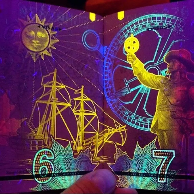 Take a UV light to the inside pages of the Canadian passport, and you can spot many of Canada’s national treasures and symbols lit up in neon. These include maple leaves, historical figures, ships at sea, spectacular fireworks in the city of Ottawa, and of course, the Niagara Falls.