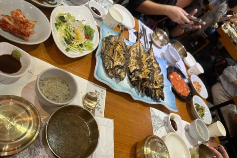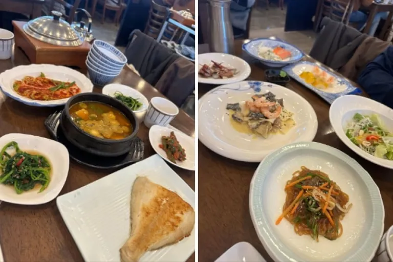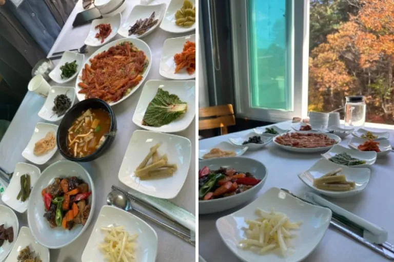 Afterwards, we had another generous round of hanjeongsik at Gombawoo Restaurant where we were treated to grilled deodeok (ginseng root)! The crunchy deodeok is a must-try! It was served with a sweet sauce that masked the slightly bitter taste. Adding to the experience, the restaurant offered stunning views of the vibrant autumn scenery. As we dined, the warm hues of red, orange, and gold leaves outside created a picturesque backdrop that made the meal all the more memorable.
