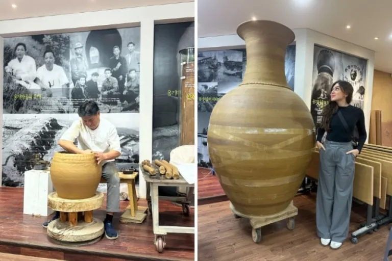 Just a short drive away was the Ulju Oegosan Onggi Village, where we learnt about the time-consuming process of pottery making. Creating a simple piece of pottery is a meticulous process that takes approximately two weeks. This includes shaping the clay, drying it, adding colour, and finally baking it in a kiln. The baking stage is particularly delicate, as around 20% of pieces can break due to the intensity of the fire. To prevent this, the pottery is baked slowly and carefully, maintaining an ideal temperature of about 1230°C to ensure durability and quality. We also watched artisans handcraft traditional onggi—large ceramic jars used for storing fermented foods like kimchi.