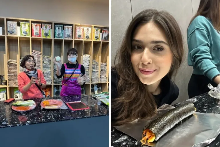 Our second day in Busan began with a unique school experience at Kimchi School, where we got hands-on with two of Korea’s most beloved dishes: kimchi and kimbap. Guided by expert instructors, we gloved up and dove right in. I chose to make kimbap, rolling up the rice, adding sesame oil, and cutting it into perfect slices — easy and delicious!