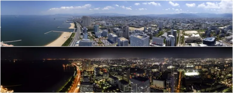Panoramic view from Fukuoka Tower in the day, and in the night | Image credit: Fukuoka Tower