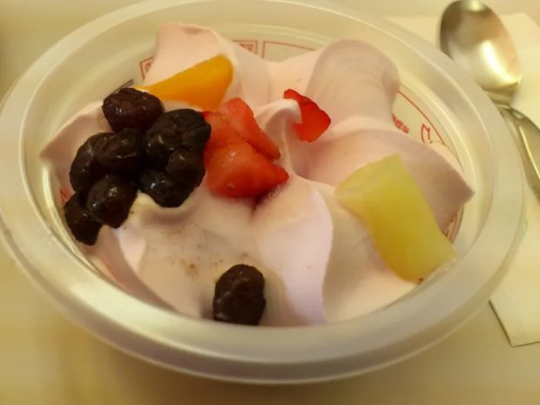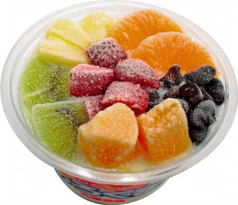 Frozen fruits, red bean and shaved ice with condensed milk.