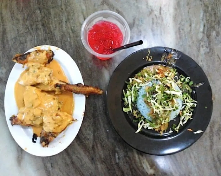 A type of nasi ulam, this blue-coloured rice dish is a popular dish in East Coast Malaysia. The rice is blue as a result of cooking the rice using petals of Kembang Telang (clitoria ternatea flowers).